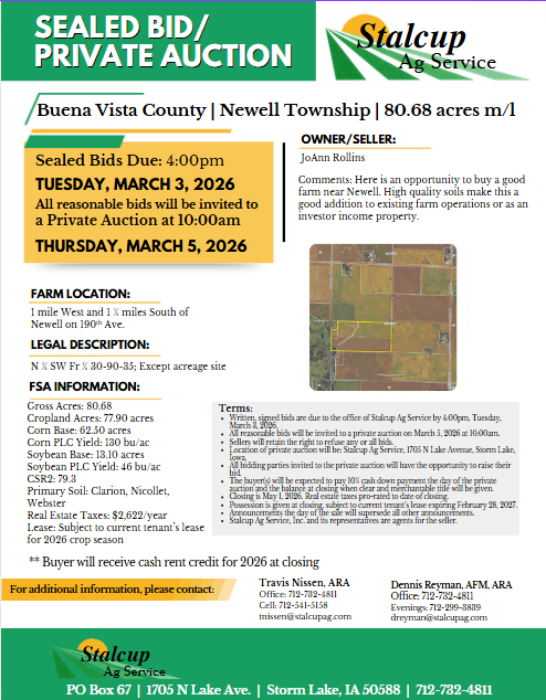 *Location of private auction will be: Stalcup Ag Service, 1705 N Lake Avenue, Storm Lake, Iowa.